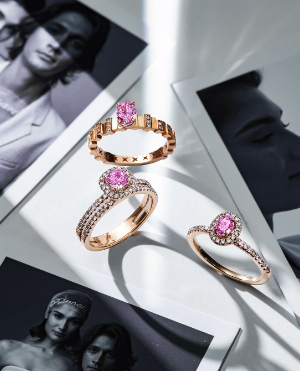 Dengan sentuhan pink sapphire, perhiasan berlian wanita ini menggambarkan kelembutan cinta sejati.