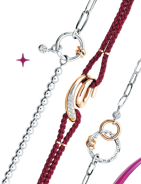 Frank & co. menghadirkan tiga bracelet di koleksi ini, yaitu Pure Light Bracelet, Fine Light Bracelet dan Bold Light Bracelet. Kalau Anda menyukai tampilan gelang yang kasual namun tetap mewah, Bold Light Bracelet bisa jadi pilihan. Gelang seberat 3.9 gram ini dihiasi dengan 6 butir berlian F VVS dalam balutan rose gold yang menampilkan doodle "M". Sentuhan gaya yang menyenangkan lewat gelang tali ini melambangkan ketahanan sebagai perpaduan sempurna antara kekuatan dan koneksi. Menjadikannya perhiasan bermakna namun versatile untuk dikenakan sehari-hari.
