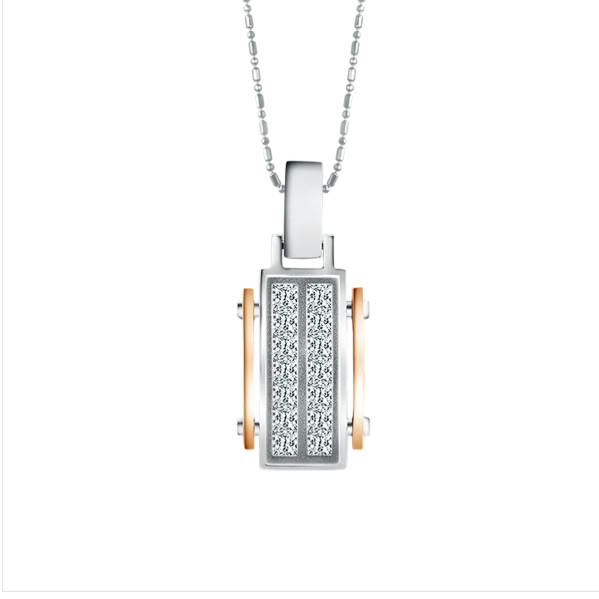 Desainnya yang minimalis namun menonjol memberikan aura percaya diri dan kesan eksklusif dalam berbagai suasana, baik formal maupun kasual. Kalung pria dengan tambahan pendant ini hadir dengan desain two-tone yang elegan, memberikan kesan kuat dan berkelas.