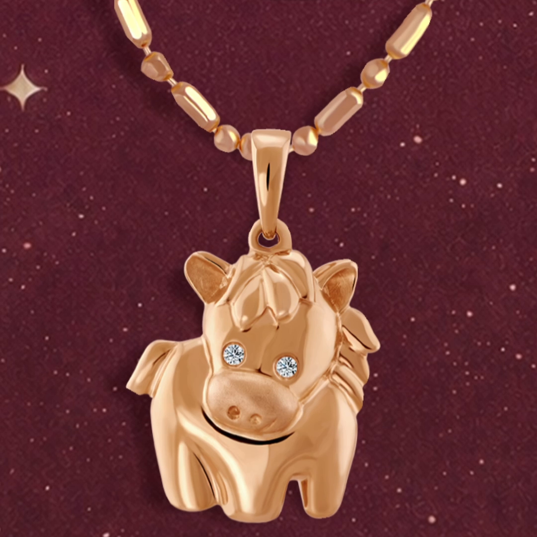 Liontin ini terinspirasi dari shio kuda, melambangkan semangat bebas, kekuatan, dan ambisi yang tinggi. Desainnya berbentuk kuda yang halus dan elegan, dibuat dari 18K rose gold dengan aksen berlian yang menambah kilau dan karakter unik. Selain tampilannya yang chic, liontin ini juga membawa makna positif tentang dorongan kuat untuk mengejar tujuan hidup. Cocok sebagai hadiah yang penuh harapan dan simbol keberanian.