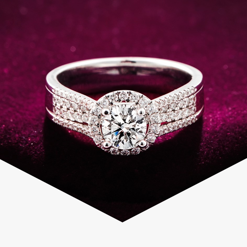 - Cincin pertunangan: potongan round, oval, atau princess dengan setting solitaire atau halo